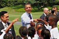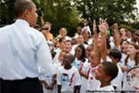 - President Barack Obama talks with kids attending a Let’s Move tennis clinic on the South Lawn of the White House, Aug. 3, 2010. © Official White House Photo by Pete Souza