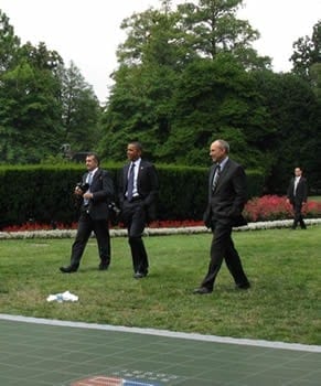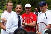 - President Obama with Sam Querrey and Bob and Mike Bryan at the QuickStart clinic on the South Lawn. © Max Cook